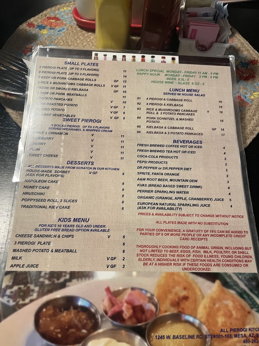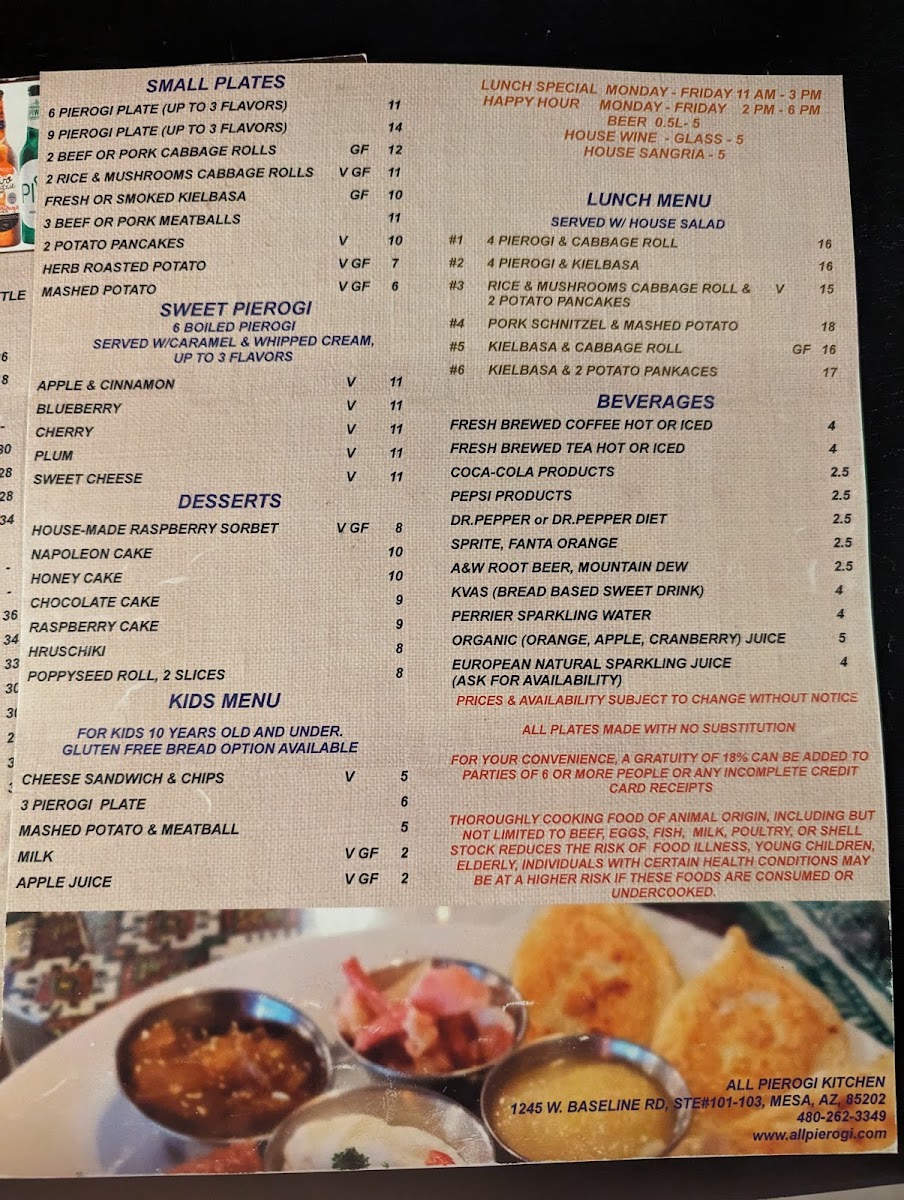 Welcome to All Pierogi Kitchen / Restaurant & Euro Market Menu, where every dish is an invitation to experience authentic European flavors. Nestled in the heart of Mesa, AZ, this cozy spot offers a variety of freshly made pierogis, alongside a curated selection of European delicacies. From hearty, comfort-filled dumplings to mouthwatering market items, you’ll find something to please every palate. Whether you’re craving a classic potato and cheese pierogi or something with a little more flair, the menu showcases a rich blend of traditional and innovative offerings. With its welcoming atmosphere and family-friendly vibe, it's the perfect place to enjoy a meal that brings the flavors of Europe right to your table.